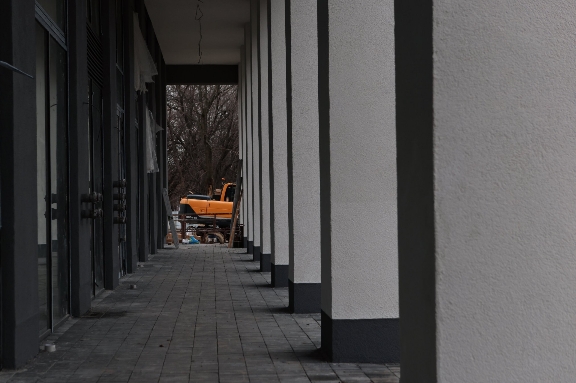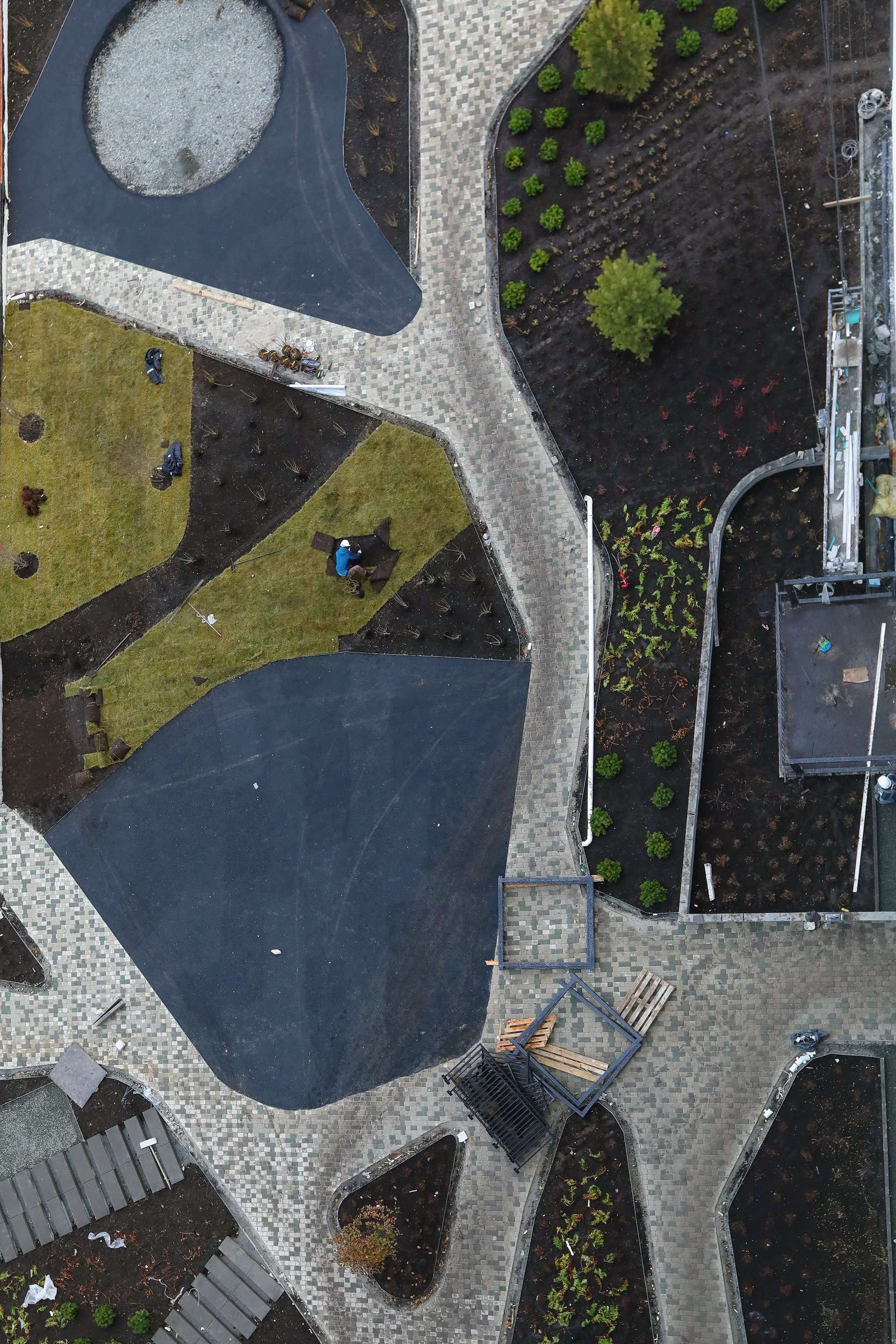 Стилобат жилого комплекса, как таинственное плато, возвышается над землей.