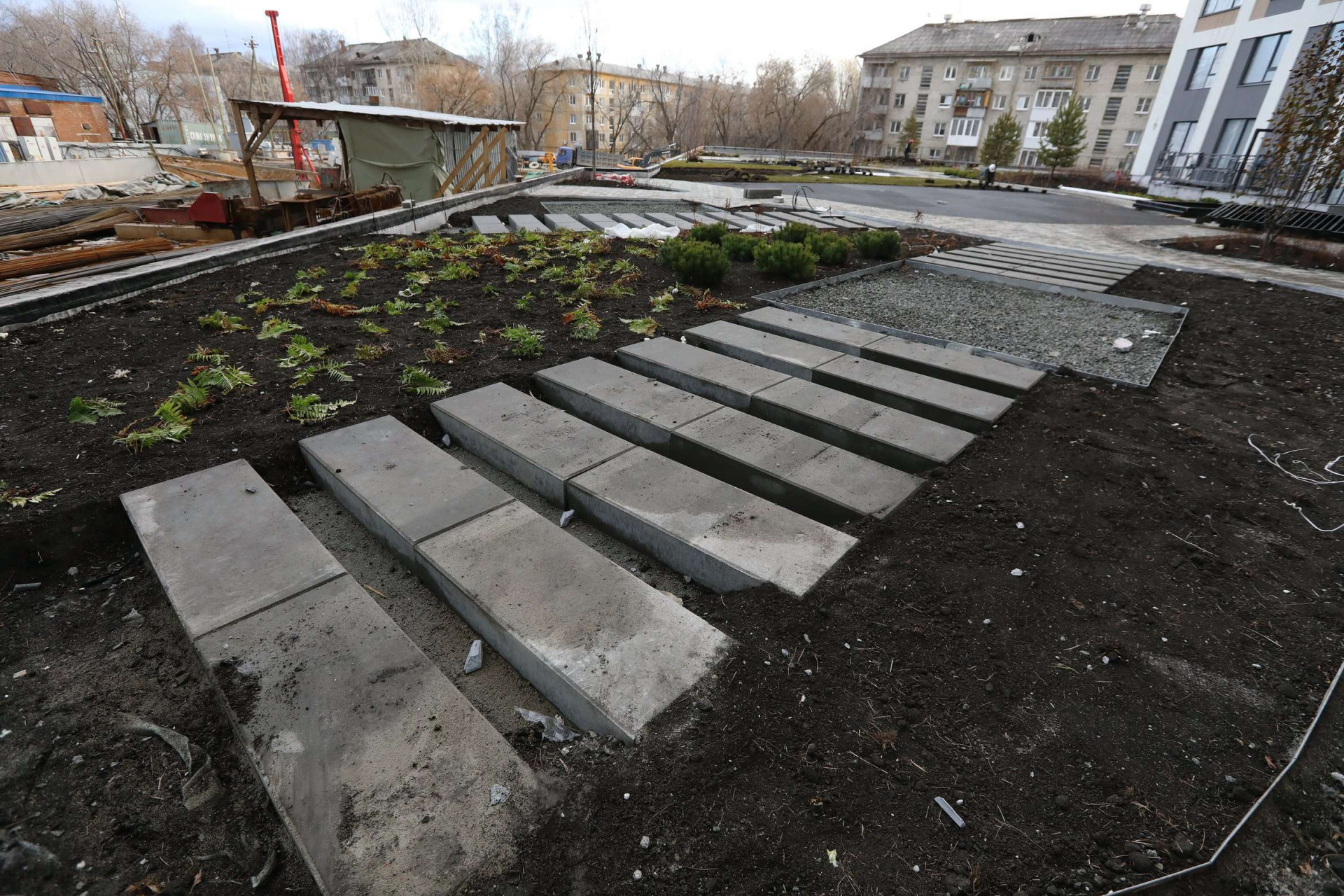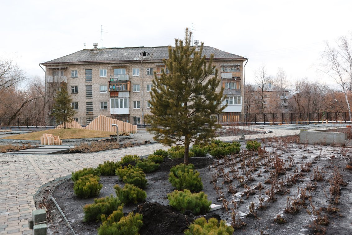 Детские площадки и места отдыха взрослых оформлены в природных тонах и материалах, а для самых маленьких жителей во дворе-парке есть Динозавр.