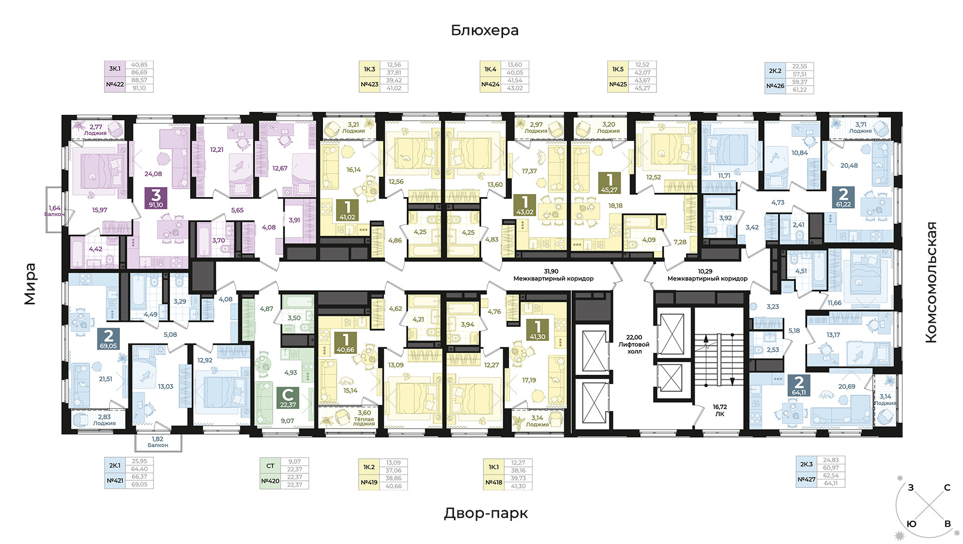 1 к. квартира, Б-26 II очередь очередь, ул. Блюхера, д. 26, корпус Секция 3,  кв. 503, пд.3, эт. 28/31, 41,02 м², 8 950 000 ₽, 218 186 ₽/м²