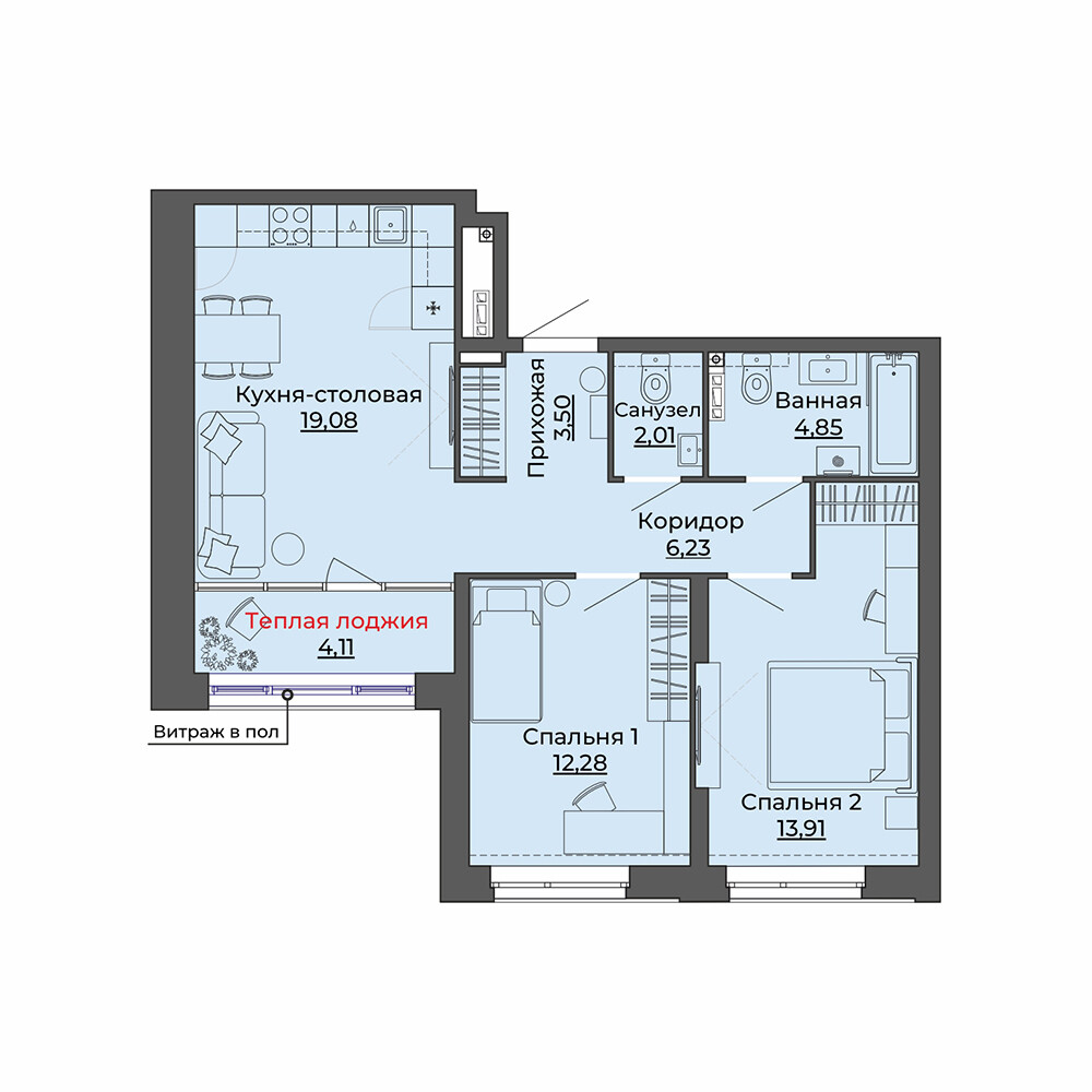 2 к. квартира, Б-26 I очередь очередь, ул. Блюхера, д. 26, корпус Секция 1,  кв. 181, пд.1, эт. 21/23, 59,75 м², 12 400 000 ₽, 207 531 ₽/м²