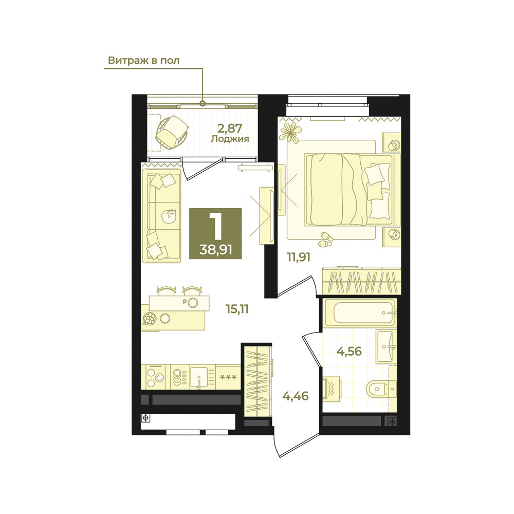 Лоджия увеличивает функциональную площадь квартиры. Вид, размер, форма могут отличаться от изображения. Конструктивные особенности уточните у вашего менеджера.