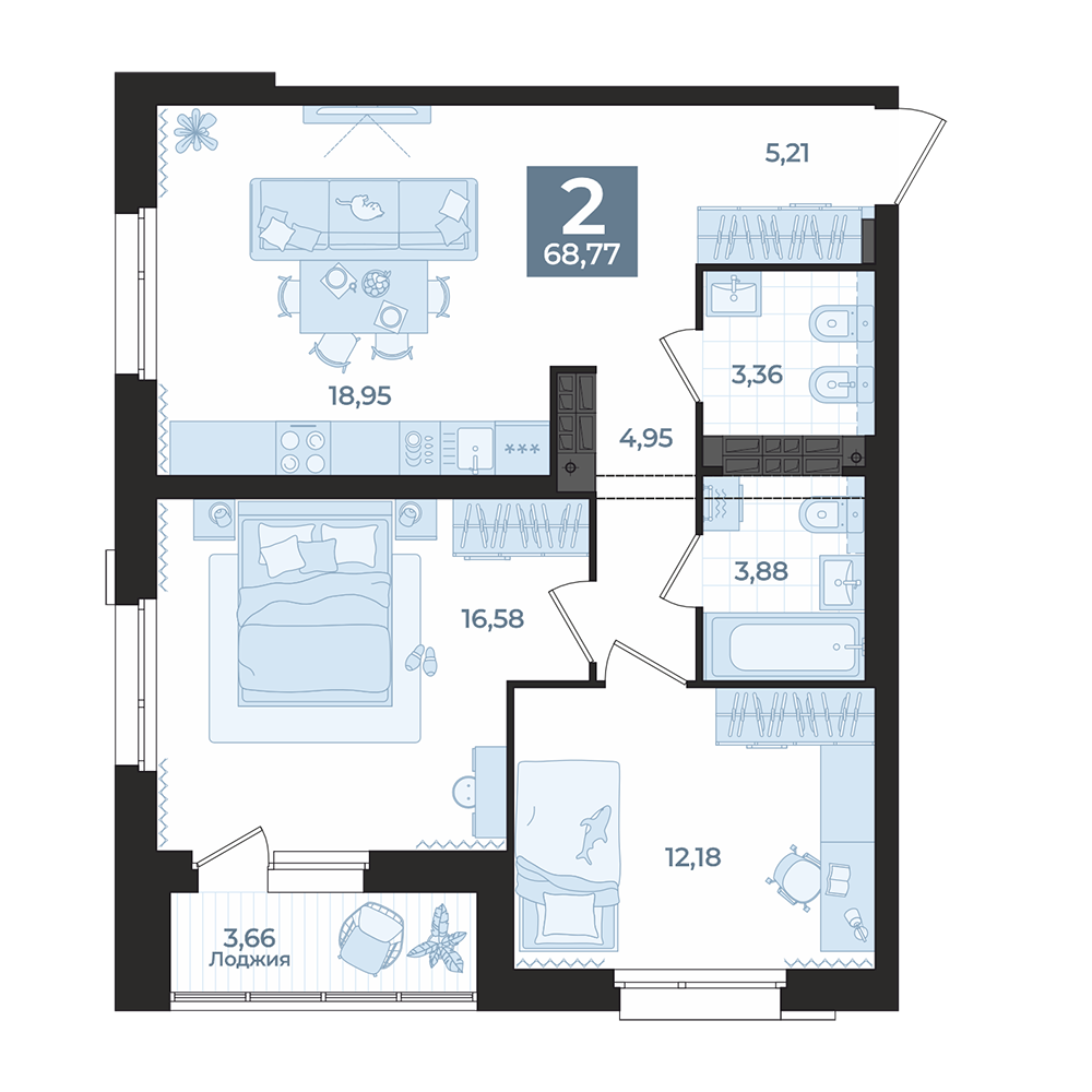Лоджия увеличивает функциональную площадь квартиры. Вид, размер, форма могут отличаться от изображения. Конструктивные особенности уточните у вашего менеджера.