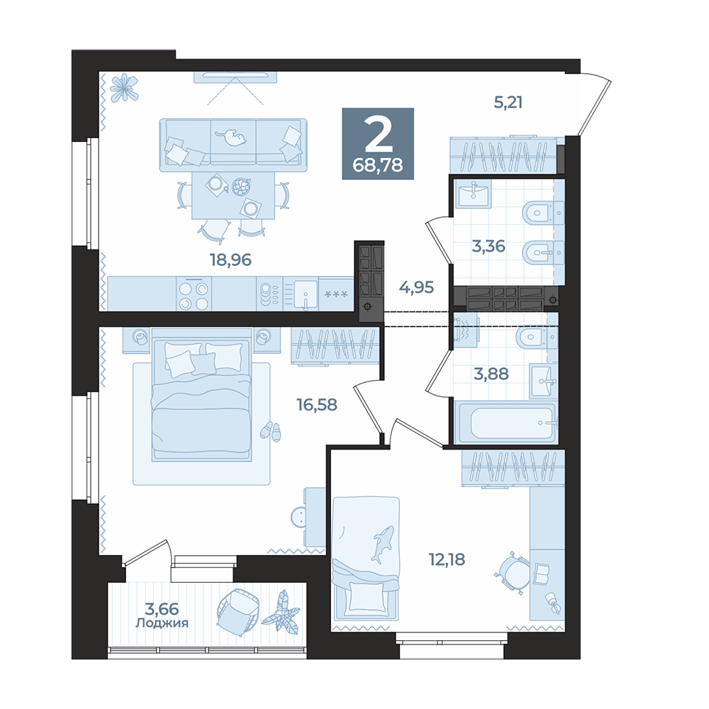 Лоджия увеличивает функциональную площадь квартиры. Вид, размер, форма могут отличаться от изображения. Конструктивные особенности уточните у вашего менеджера.