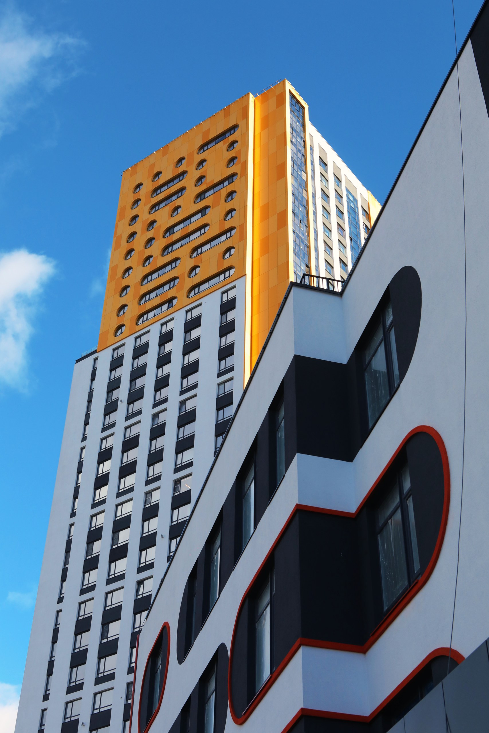 Жилой комплекс выделяется своей архитектурой: круглыми окнами, контрастными фасадами, подсветкой.