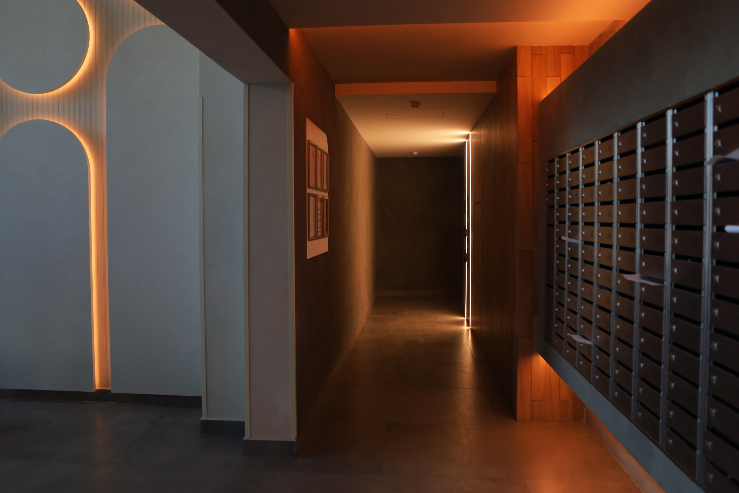 Дизайнерские холлы. Парадный холл с остеклением в пол, гостевыми санузлами и зонами ожидания.