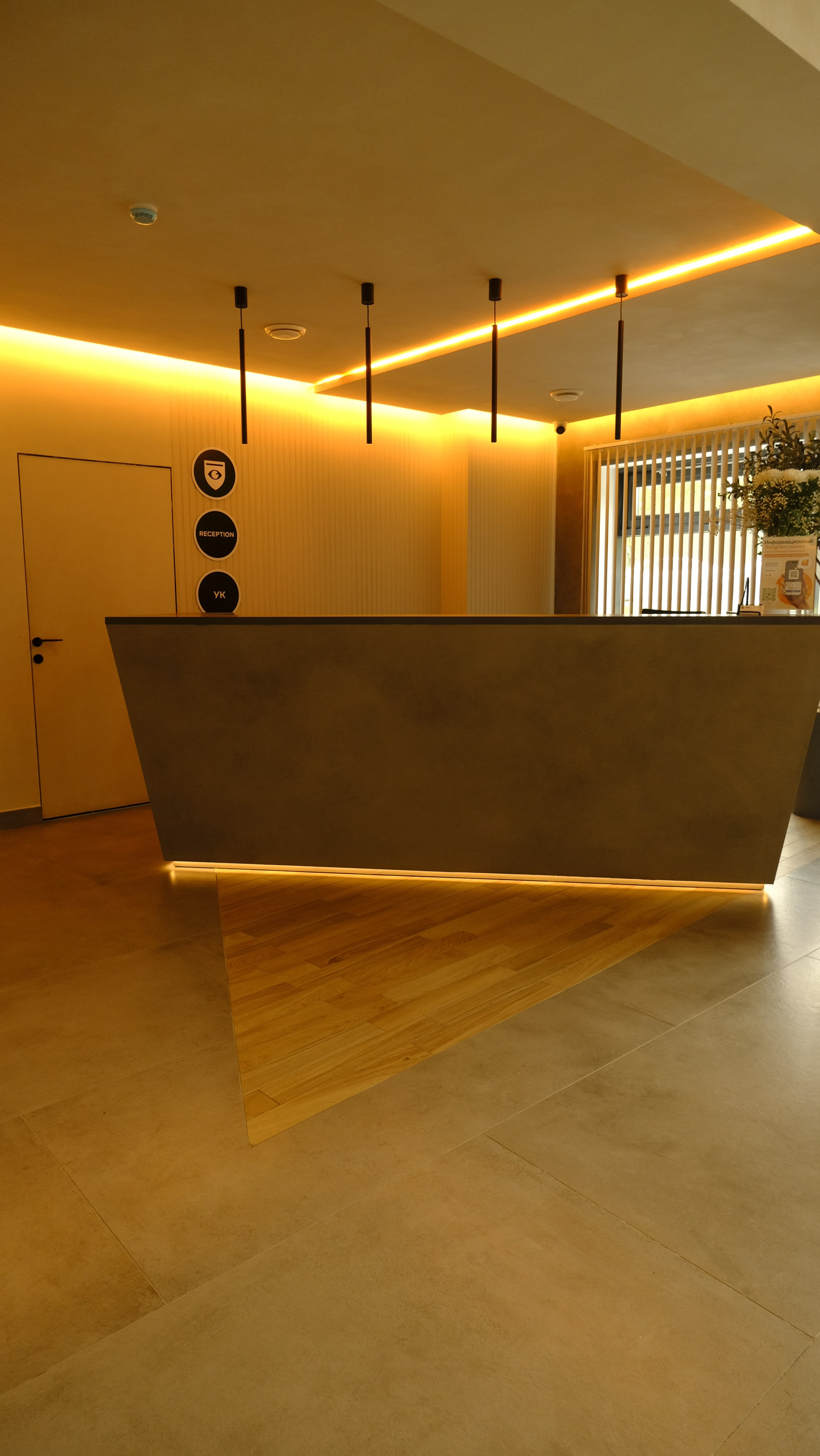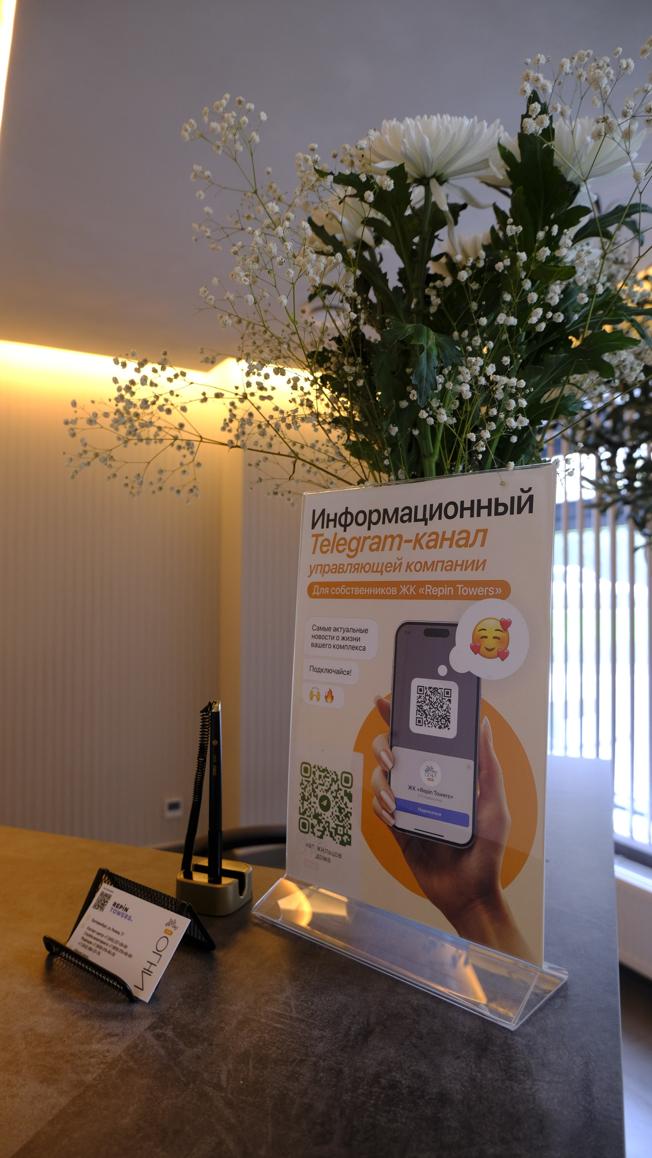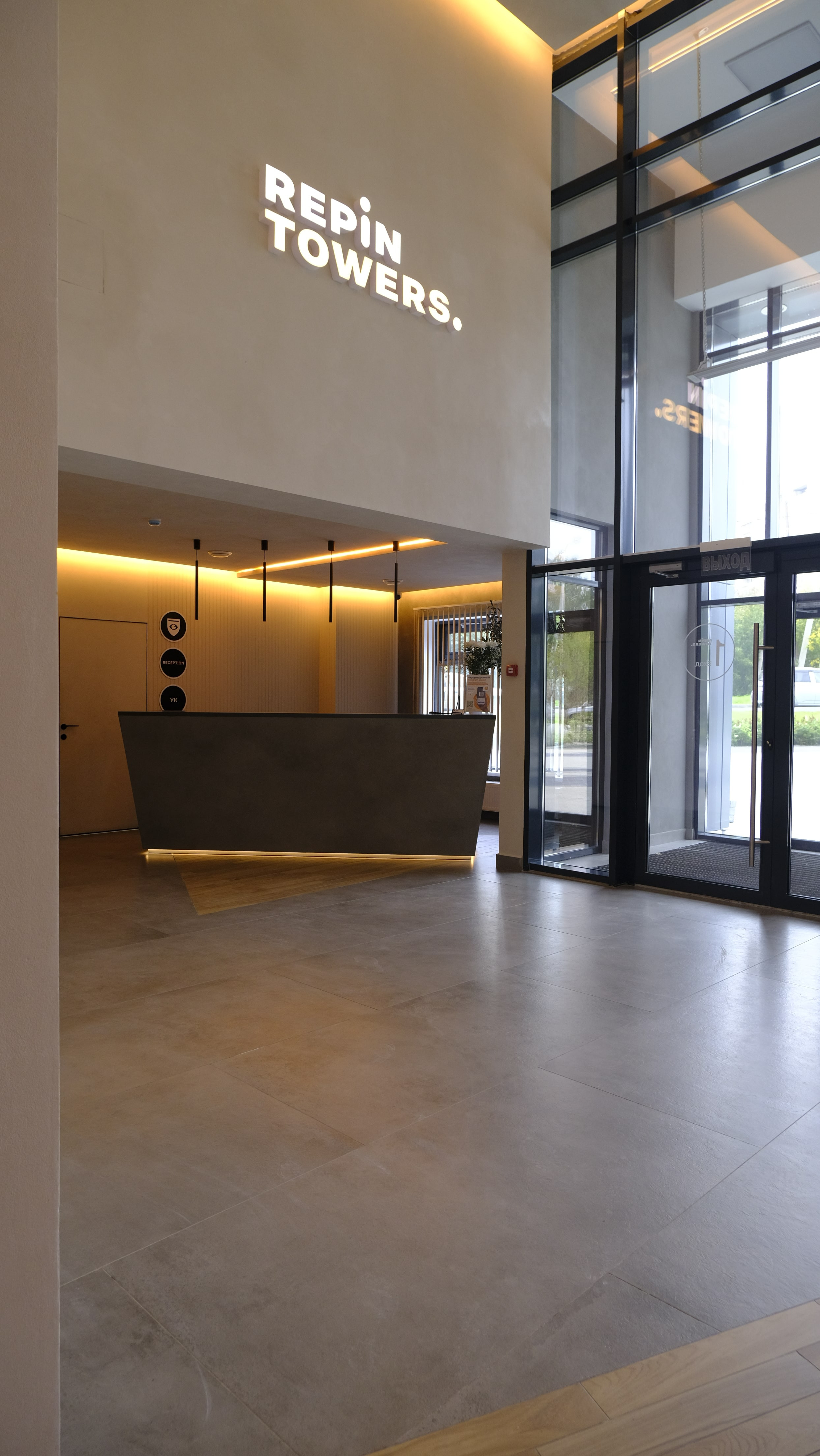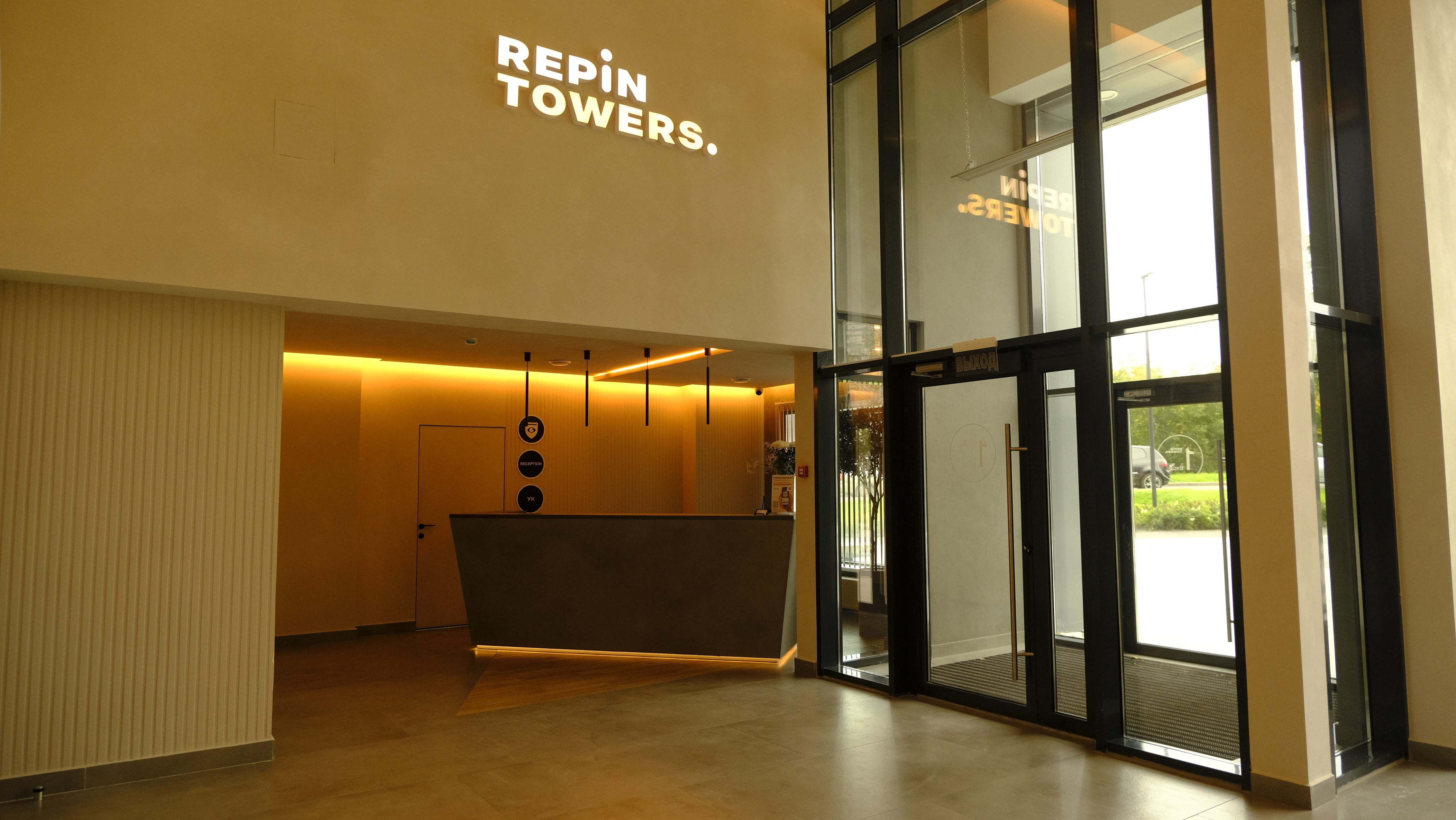 В Repin Towers предусмотрен холл с ресепшн, зоной ожидания, гостевым санузлом, чтобы комфортно вызвать такси, встретить курьера, получить интересующую информацию от управляющей компании. Предусмотрен просторный тамбур без порогов для удобного проезда устройств на колесах (коляски, велосипеды, самокаты).