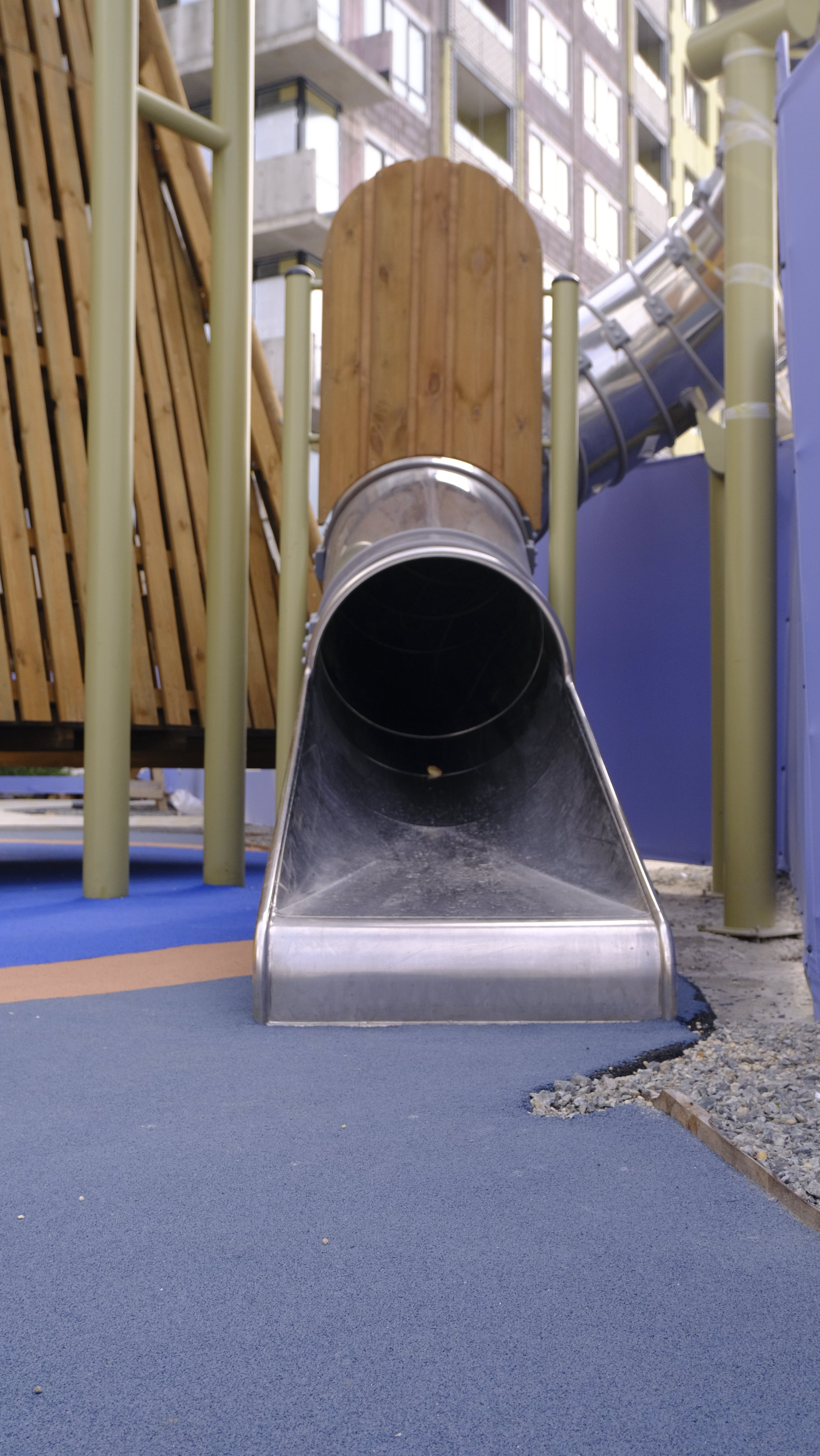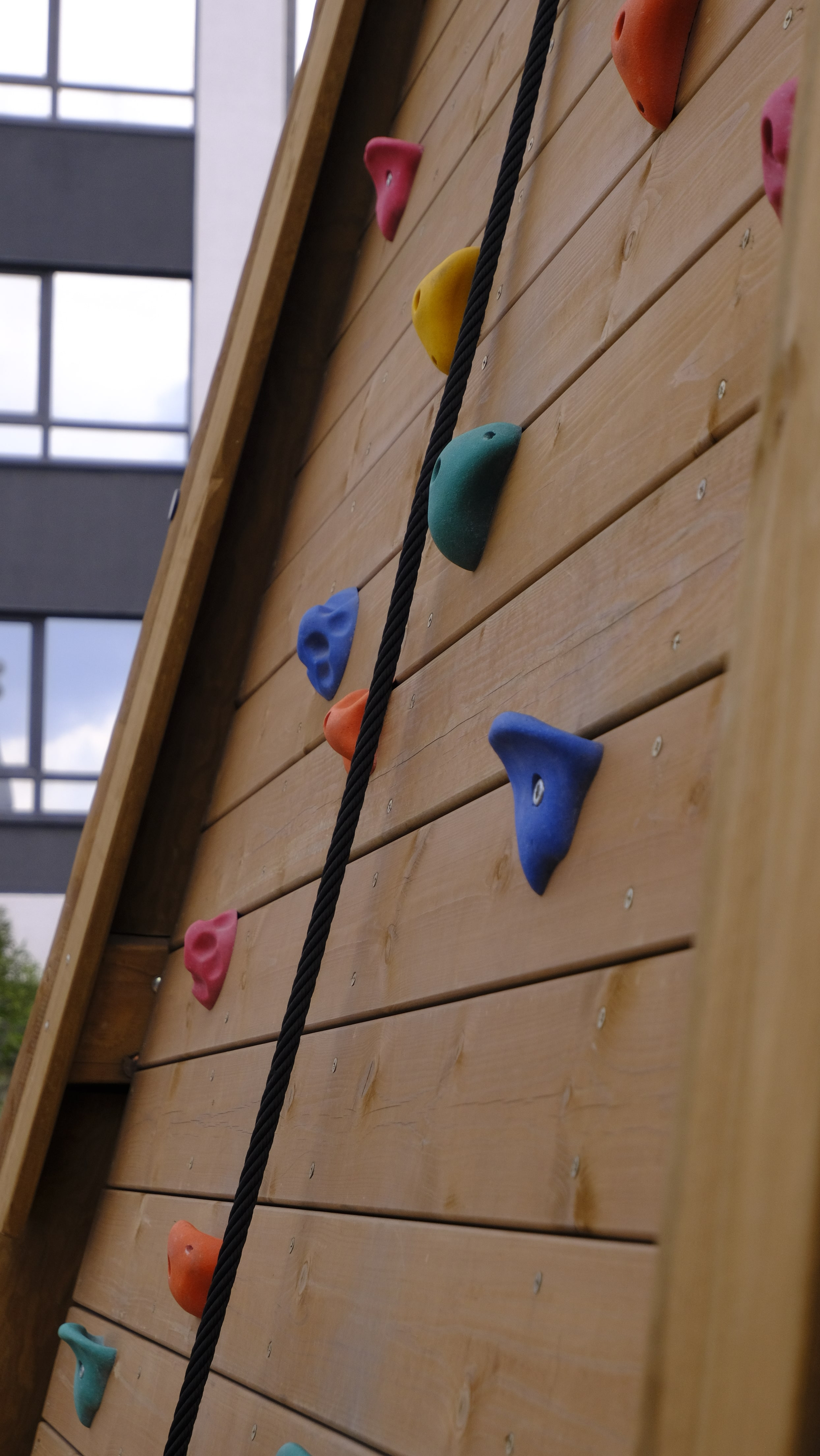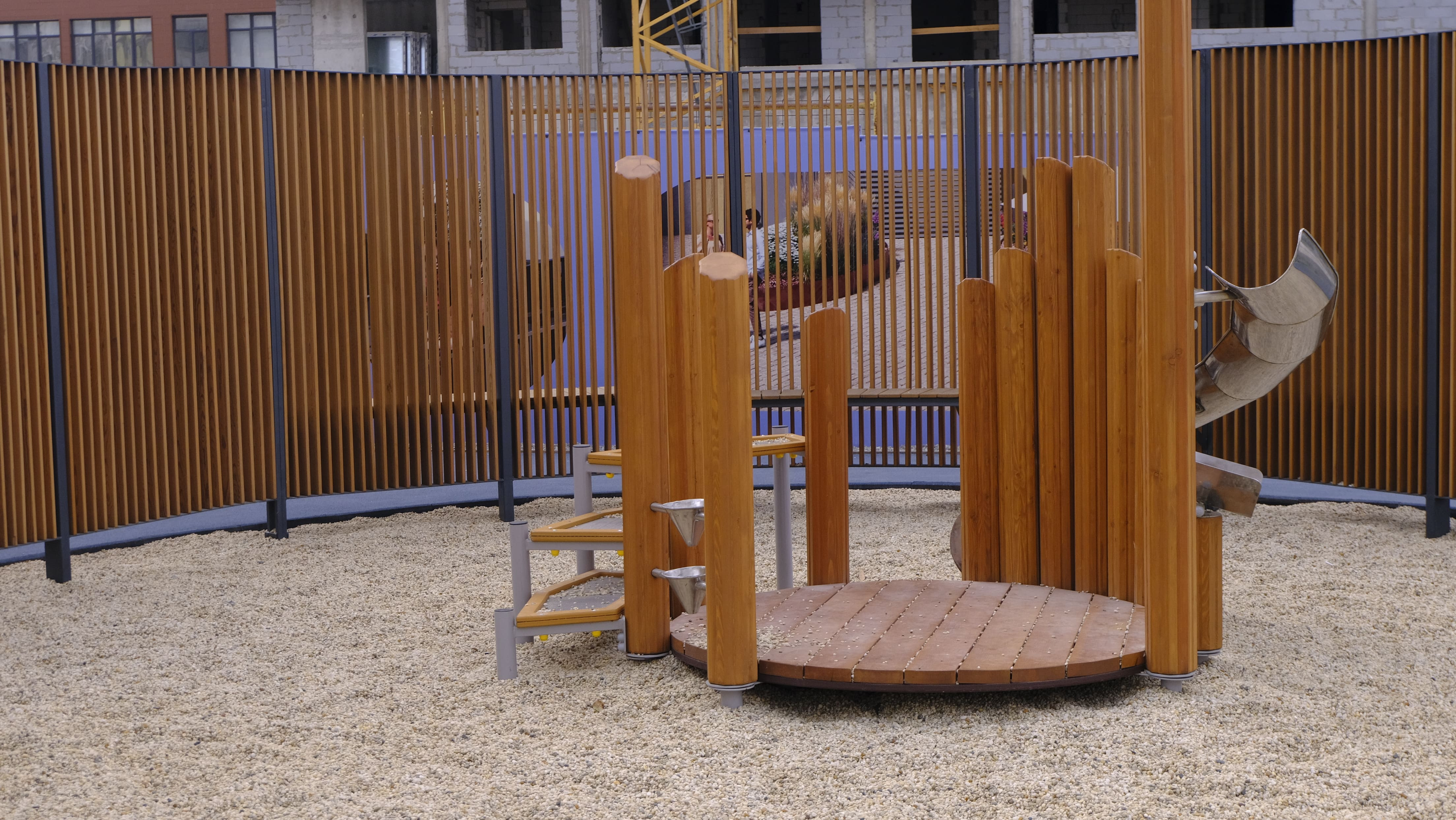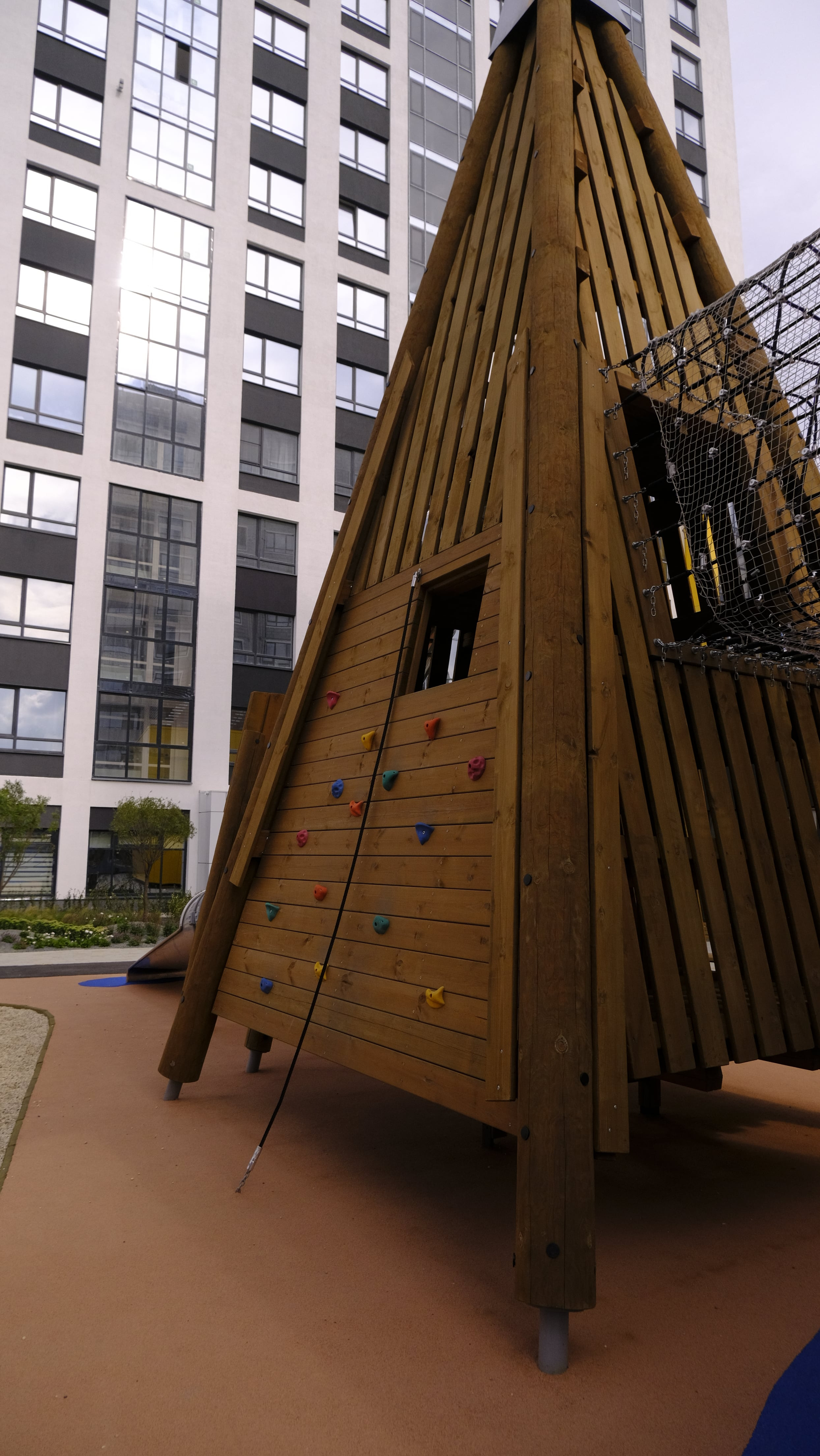 Двор без машин. Игровые площадки для детей разных возрастов, места отдыха и занятий спортом для взрослых не соседствуют с парковкой.