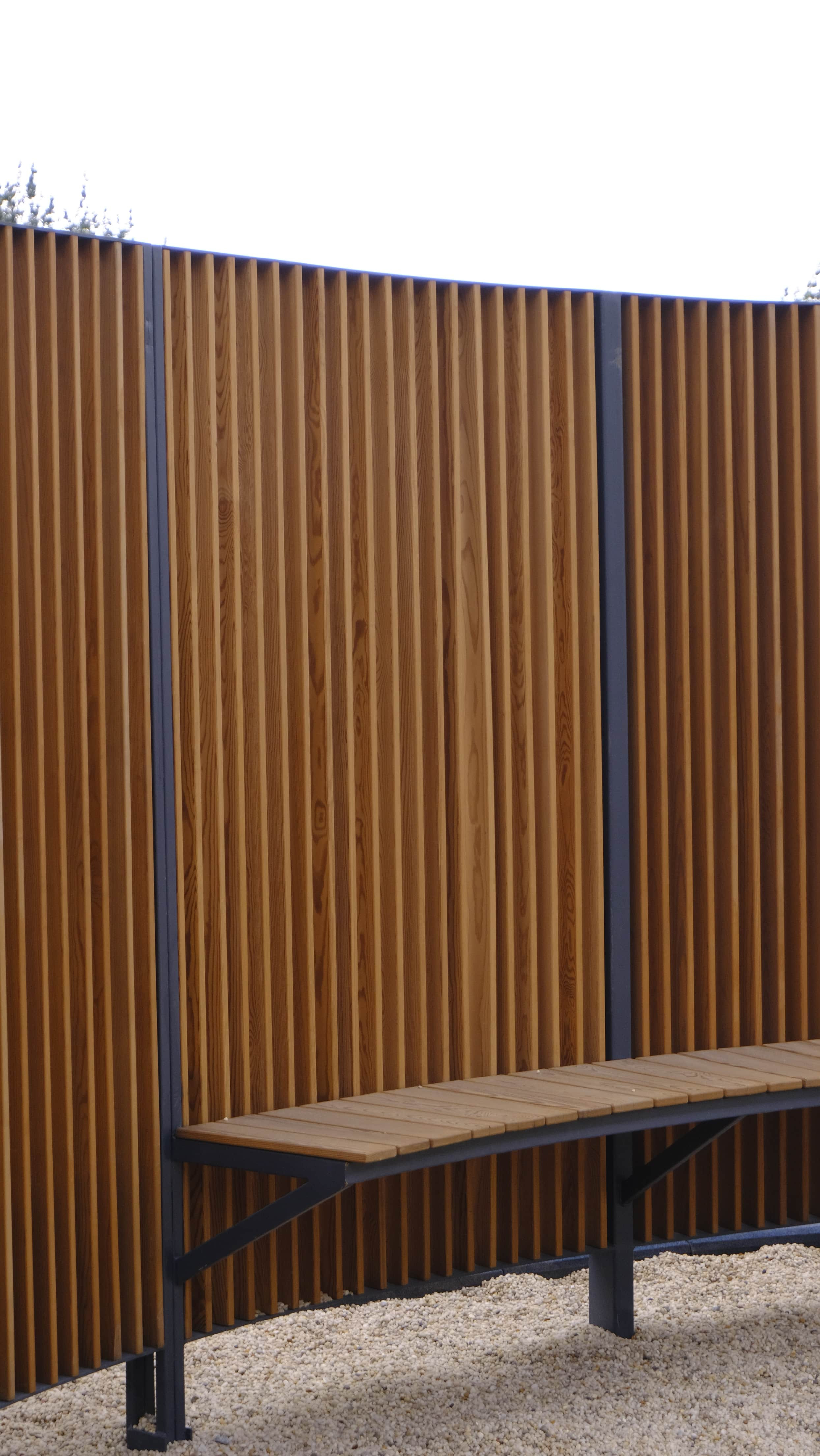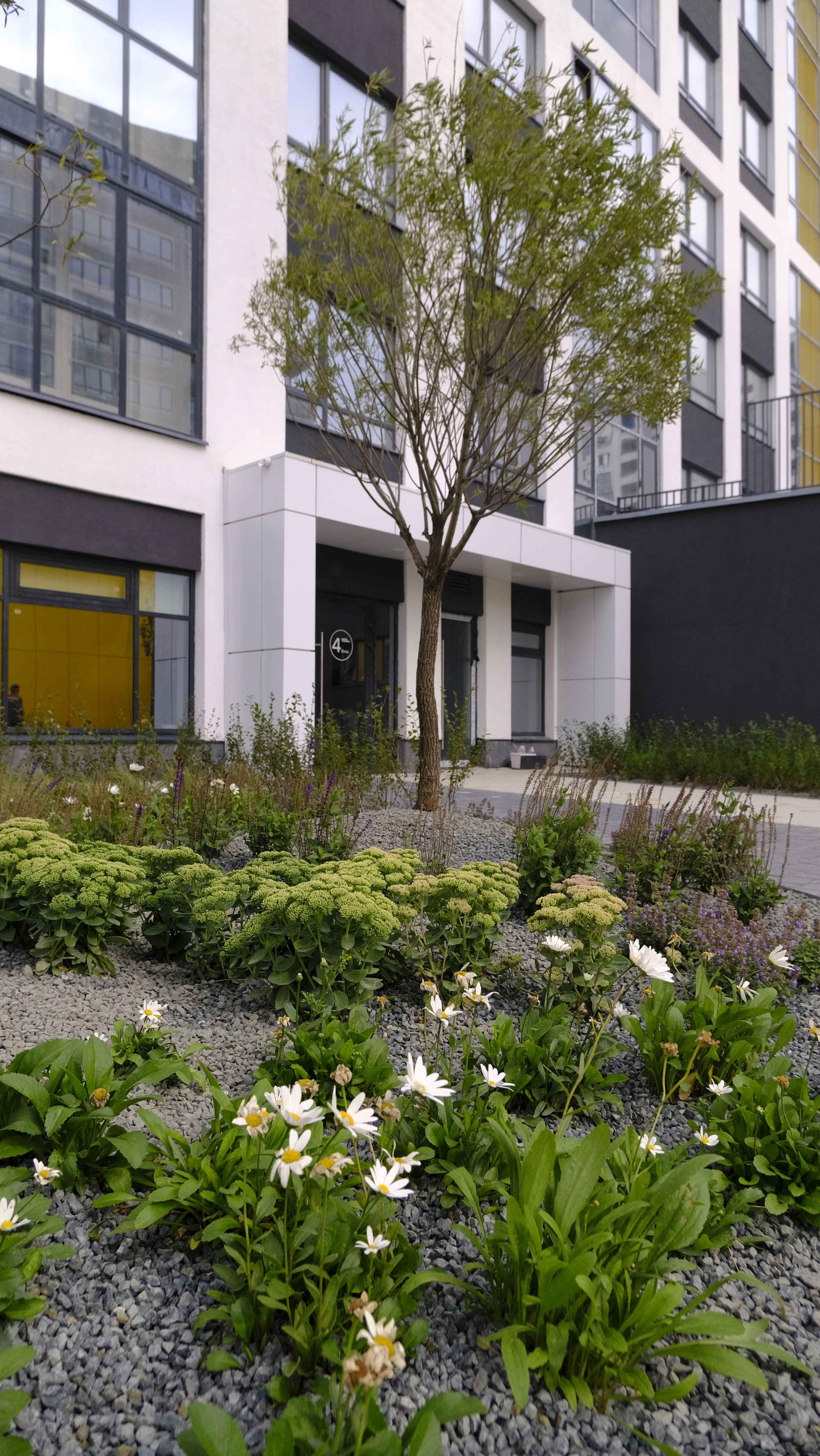 Парк во дворе. Многоуровневое озеленение и система туманообразования.